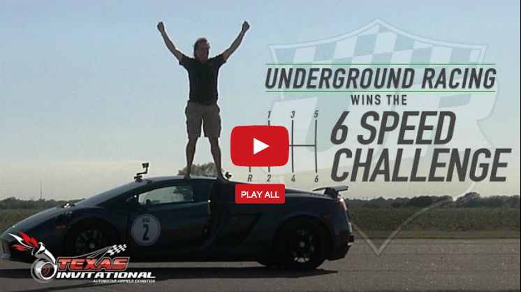UNDERGROUND RACING WINS THE 6 SPEED CHALLENGE AT THE TEXAS INVITATIONAL Huge congrats to Jason "Mullet" for winning the 6 speed challenge in his Underground Racing TT Gallardo. Also congrats to Stacy and Tag for 2nd and 3rd place in their Underground Racing TT Lamborghini's. We put together a video with a few of everyones runs. | |   DUSTIN'S UNDERGROUND RACING 2R TT SUPERLEGGERA AT TI Here is a short video of Dustin's Underground Racing 2R TT Gallardo at TI. This was his first time at the event. Dustin did a hell of a job racing his street car with the big boys of the TI event. He even beat me! Keep in mind that Dustin's car is a true street car that is ODB2 compliant. It also uses the factory Egear control system. This TTG could have left Texas and drove to California and back home to Georgia. He was also running on R888 street tires through the entire event, like the rest of his teammates. Huge thanks to our team and John Reed Racing.