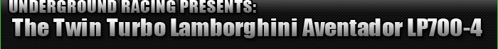 Underground Racing is proud to release the first Twin Turbo Lamborghini Aventador LP700-4. Our team was very eager to get started with an Aventador project since it was first released from Lamborghini. Once this Aventador made it to Underground, we quickly began to engineer the TT system and full build for this amazing platform. Countless hours of R&D and hard work went into this project. We spent a lot of time driving and studying the inner workings of the Aventador, and this platform is amazing, but it still seemed to be missing something- acceleration. The kind you can only get from a friend I call, BOOST! No doubt the Aventador is much more advanced than the Murcielago and even the LP Gallardo. It seems that the factory really tried to make it hard for the aftermarket world to modify the Aventadors though. However, the Underground Racing team moved quickly through the road blocks that exist. For now, the UR TT Aventadors will only be released with FULL engine builds. Through our research, we have found certain conditions that make this a requirement. Now that the project is complete, I have to say this is truly one amazing car with the addition of the UR twin turbo build. We clocked the TT Aventador 0-60 mph time in 2.2 seconds on OEM street tires, normal air pressure and on a regular road. This Aventador drives just as it did in stock form, just a lot faster. The Aventador shifting is amazingly fast and we were also able to pick up a bit faster shift time with our Quickshift upgrade. |